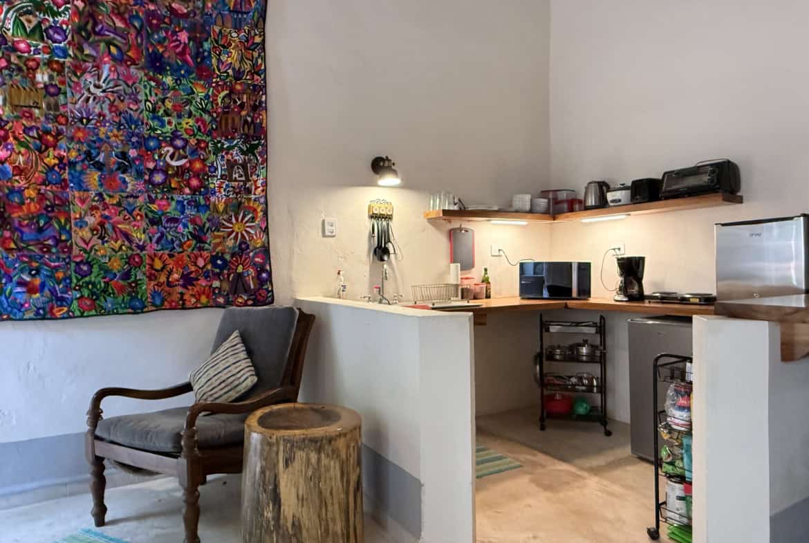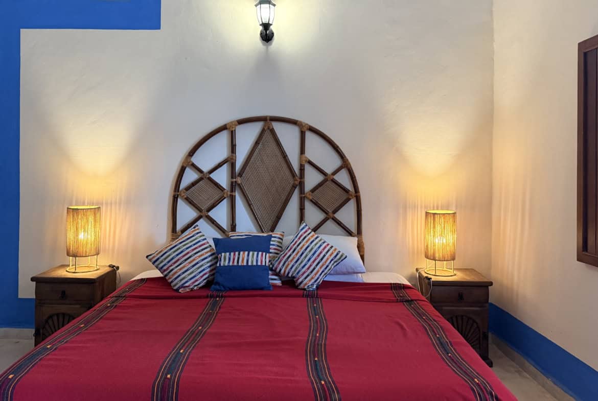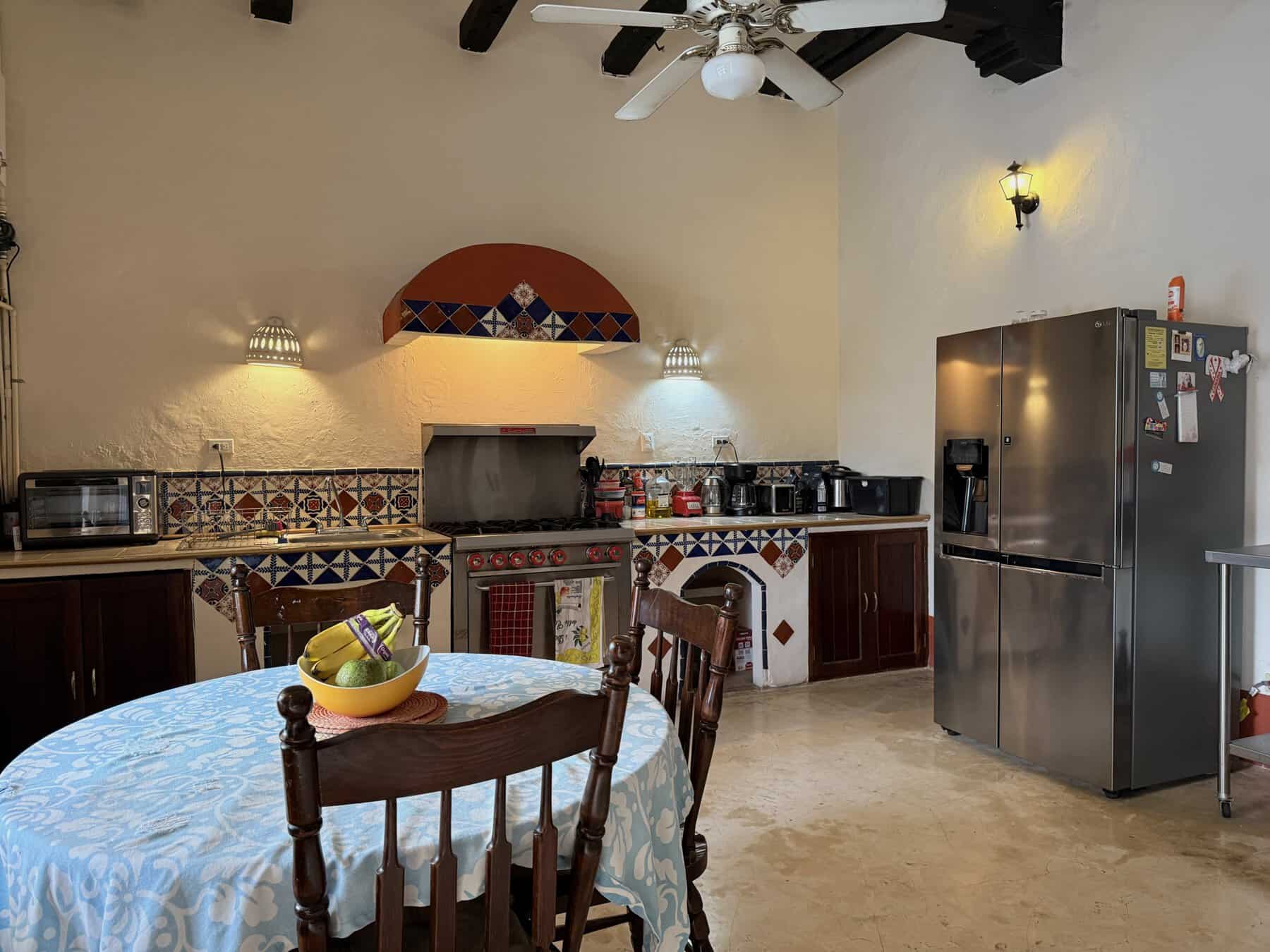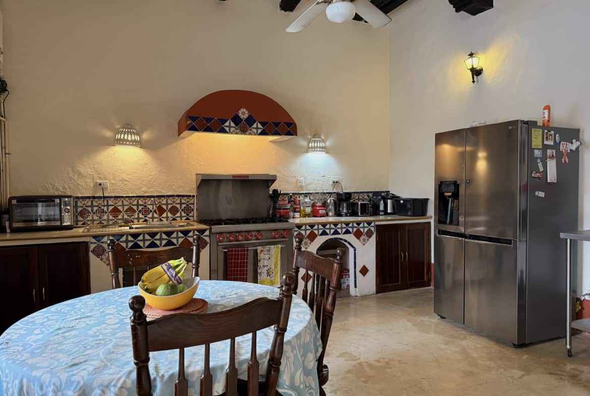 Five spacious bedrooms with bathrooms, including an independent suite with a private patio, provide space and privacy for family or guests. Colonial-style living and dining areas showcase warm textures and handcrafted finishes, while the traditional Mexican kitchen adds colour and character to daily life.